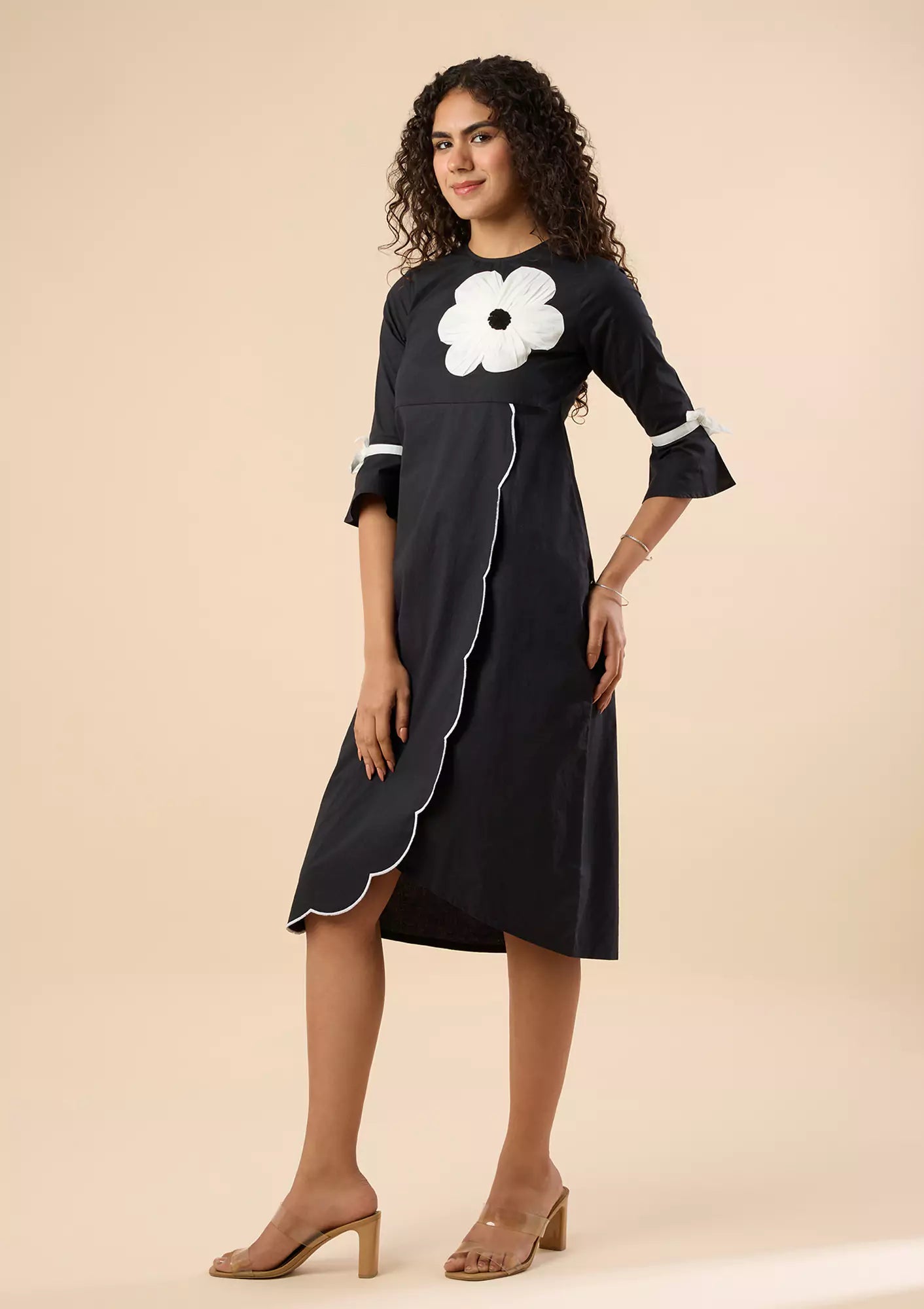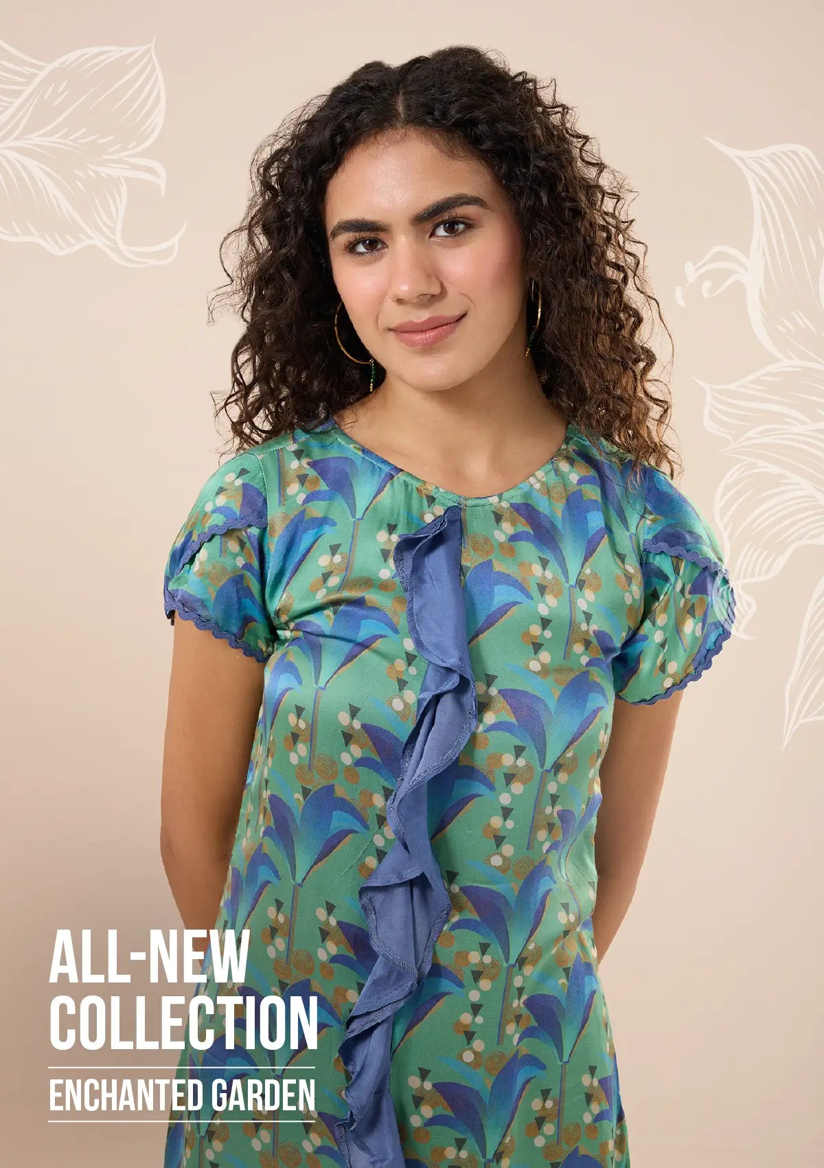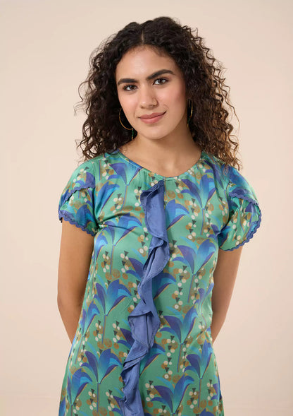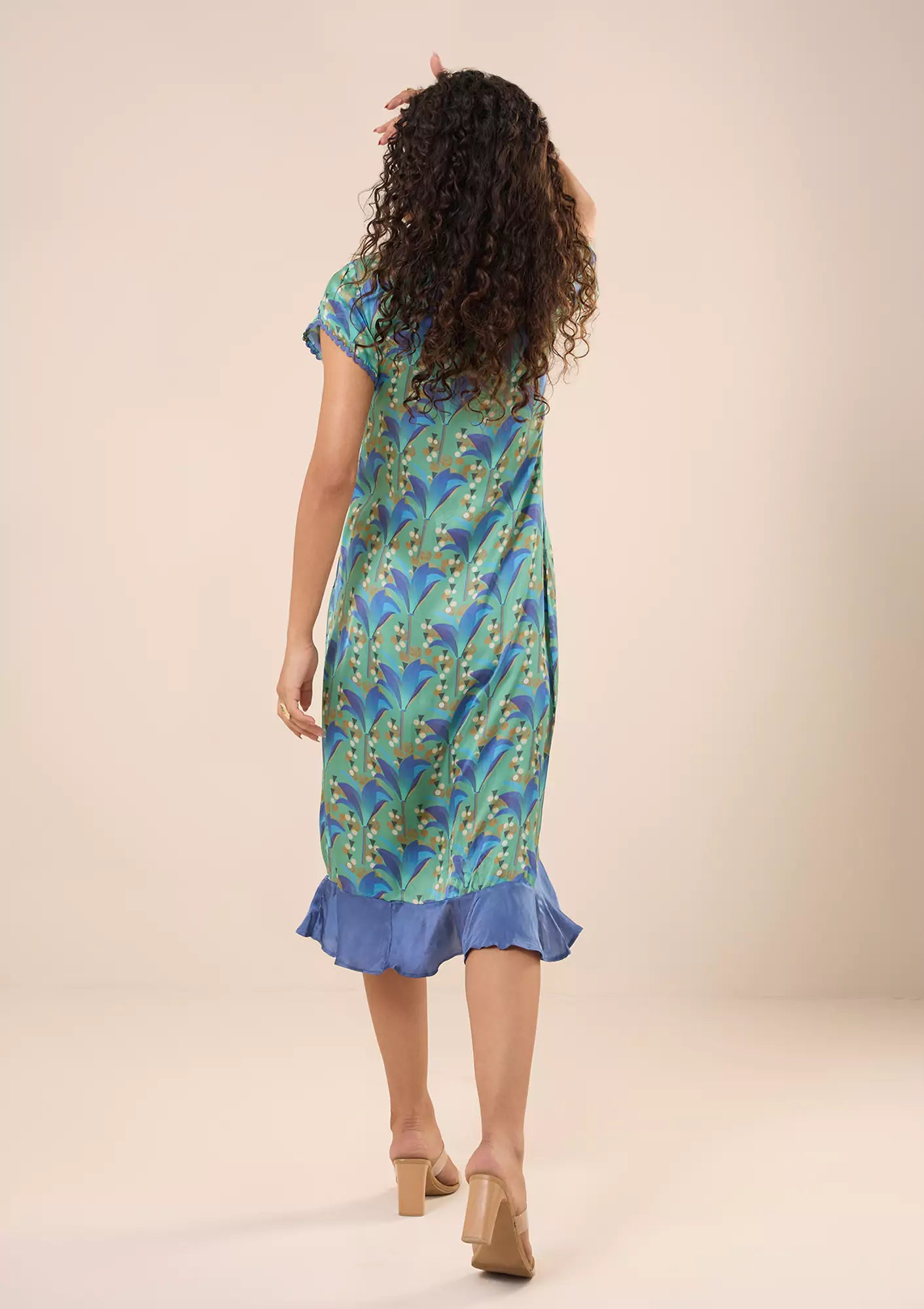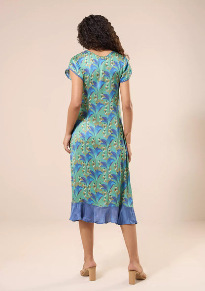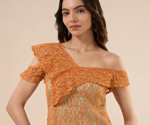 The asymmetrical neckline is beautifully balanced by a delicate lace flare sleeve on one side, adding a touch of breezy elegance. The Matching lace detailing at the waistline subtly creates a harmonious balance.