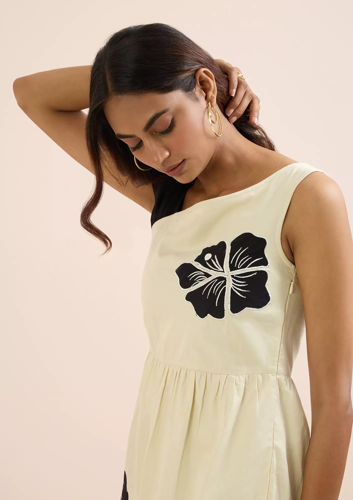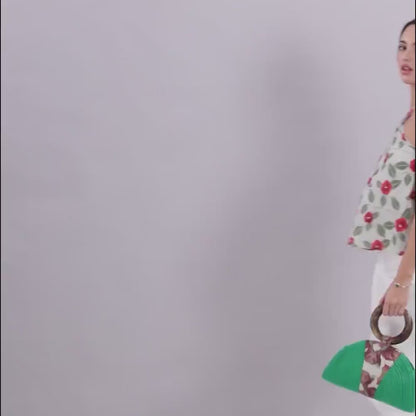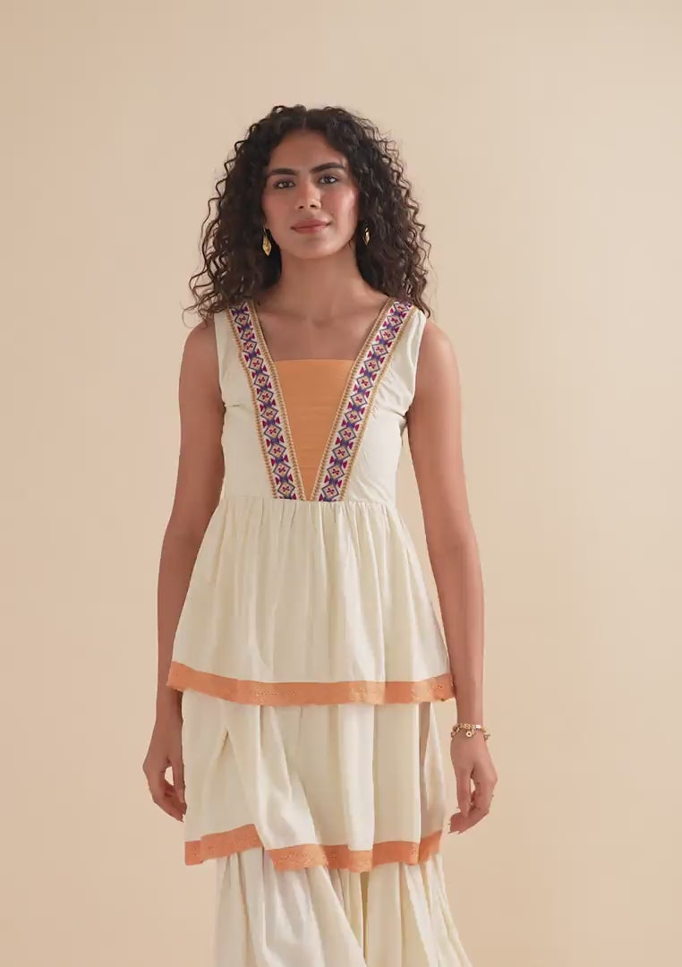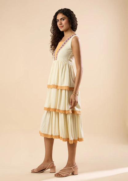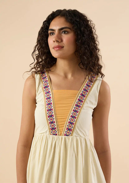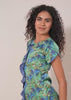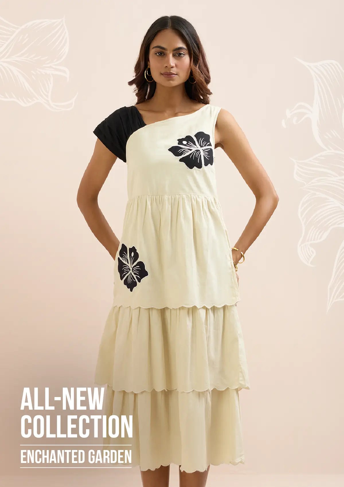 The asymmetrical neckline is beautifully balanced by a delicate lace flare sleeve on one side, adding a touch of breezy elegance. The Matching lace detailing at the waistline subtly creates a harmonious balance.