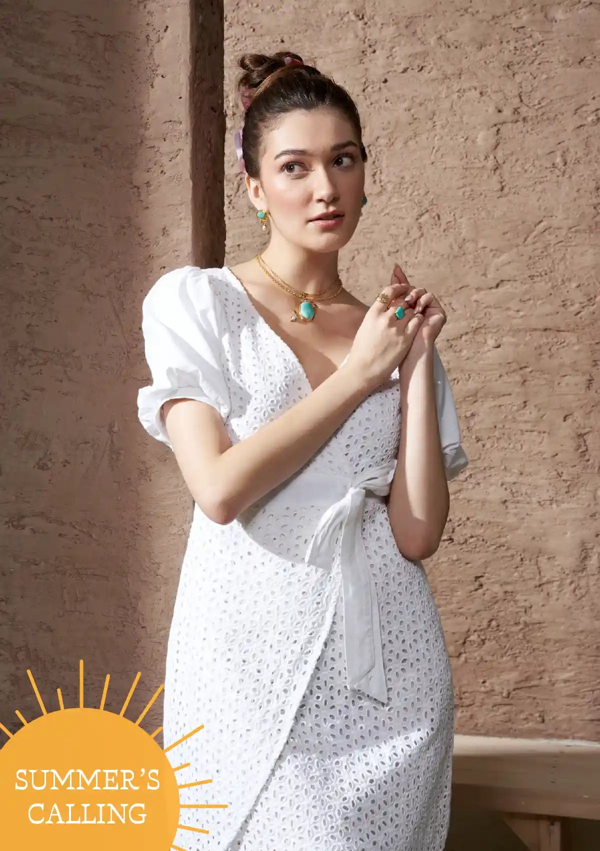 For a touch of elegance, you can pair it with pearl earrings, gold necklace and heels. A statement necklace could give a modern edge to the ensemble. For a summery look it can be paired with Crochet bags and beach sandals. Metallic touches of silver and gold add a element of sophistication.