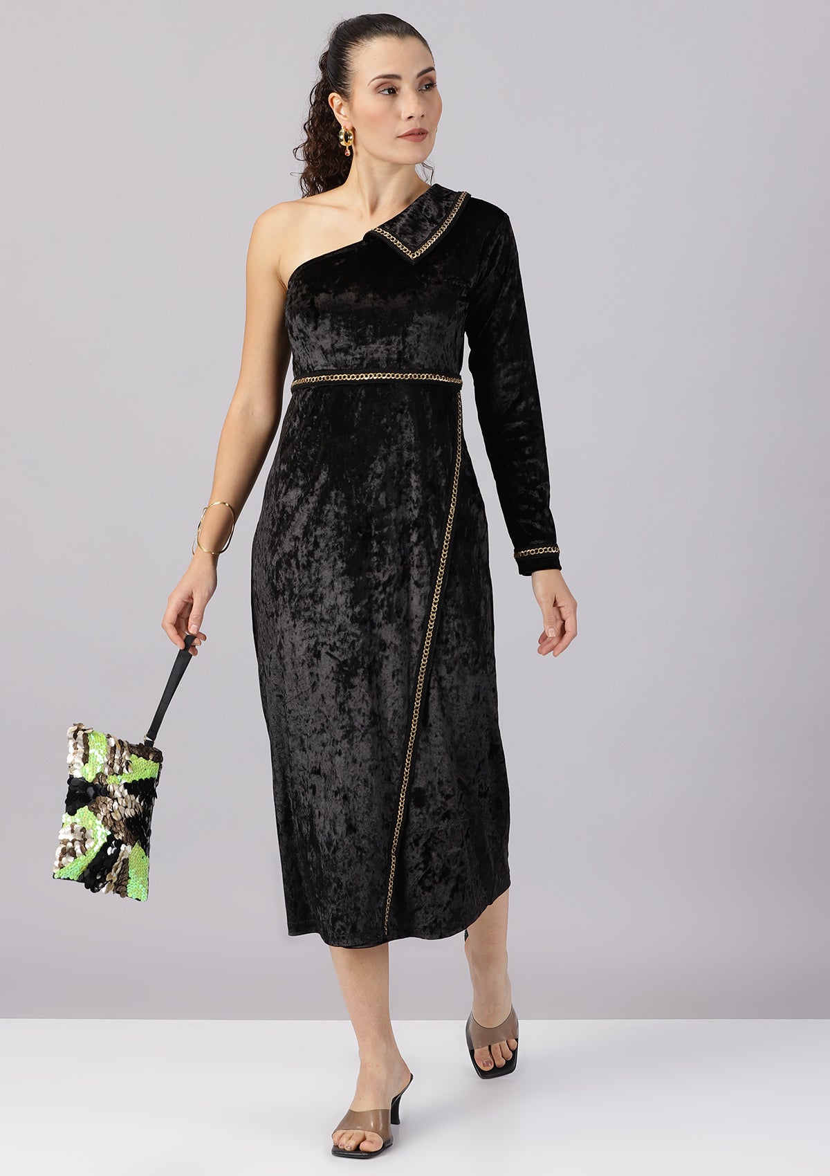 Step into the spotlight with the Soraya Cocktail Dress, a velvet one-shoulder dress with unique metal chain lace detail