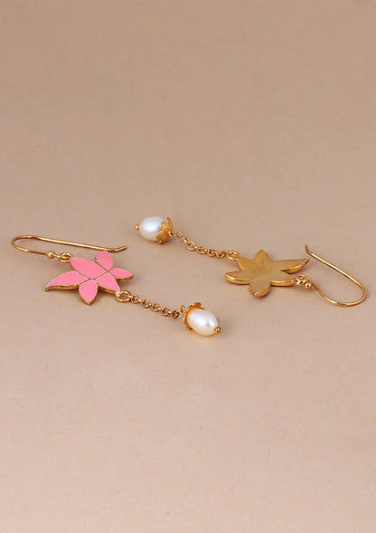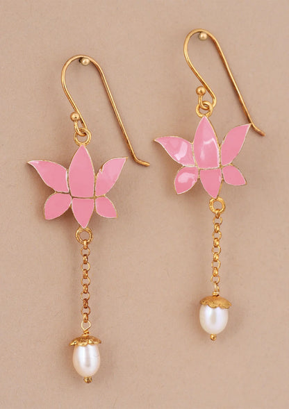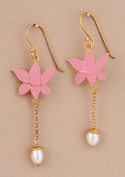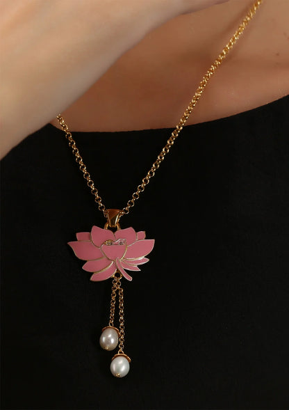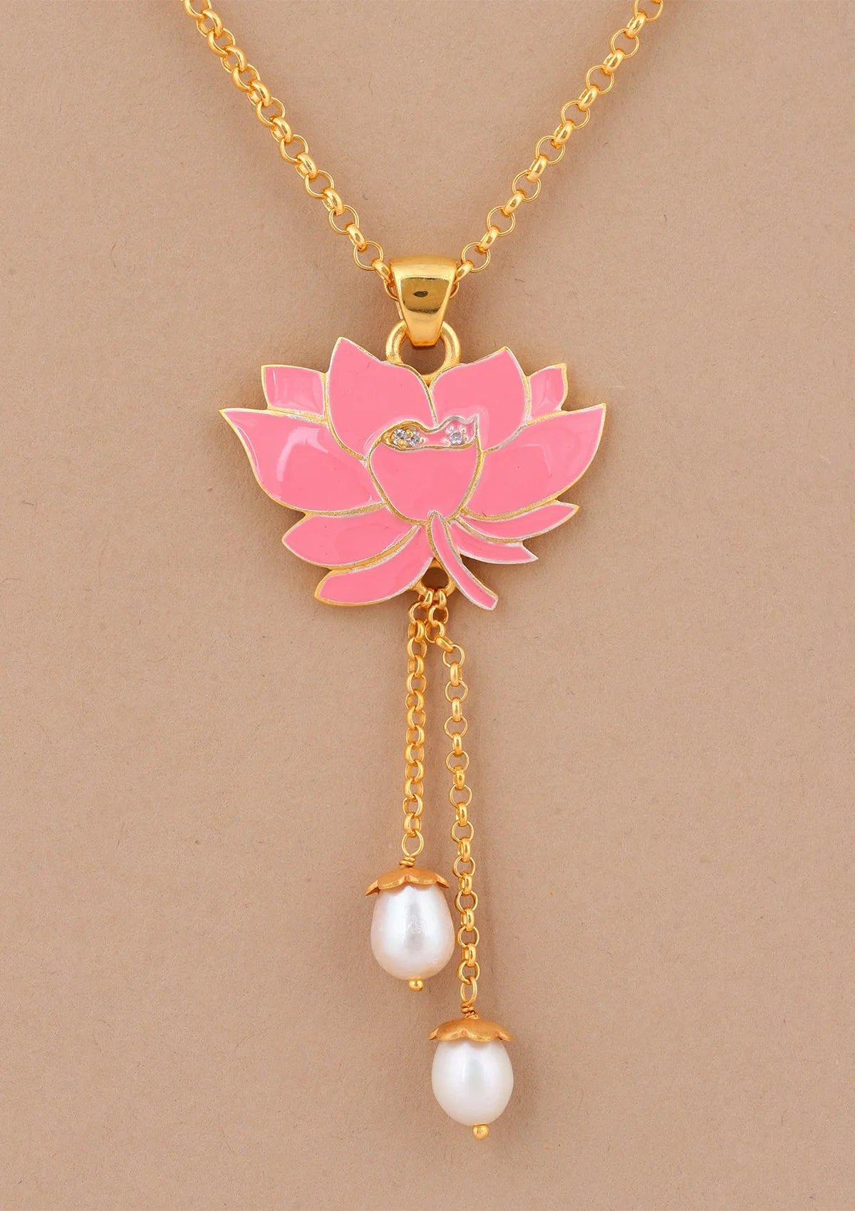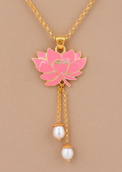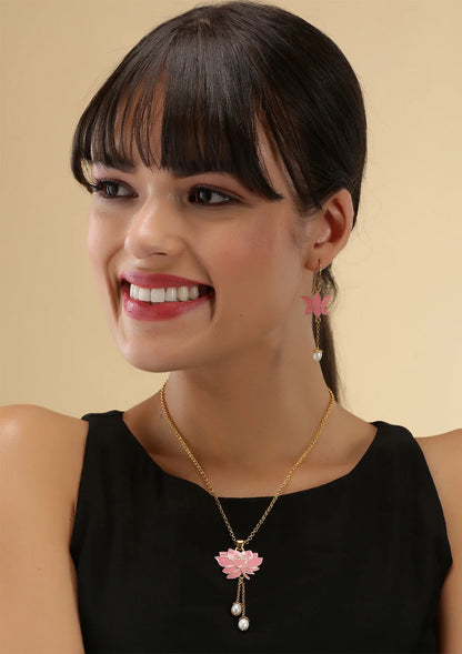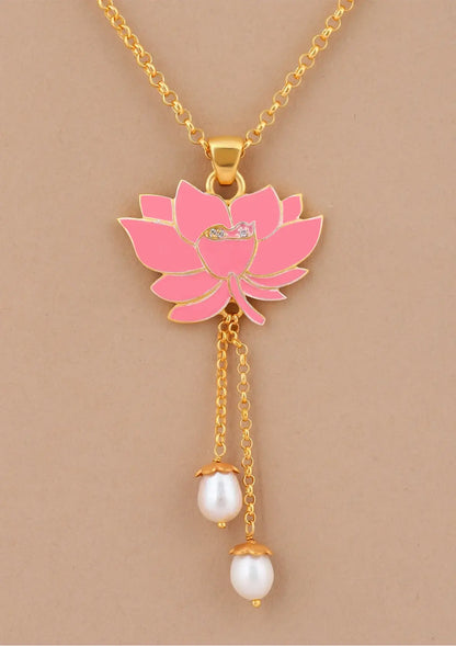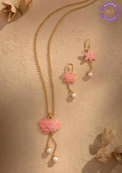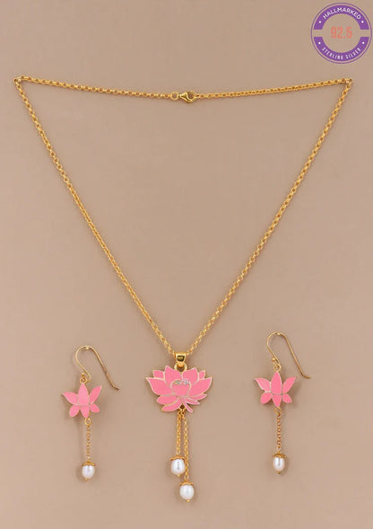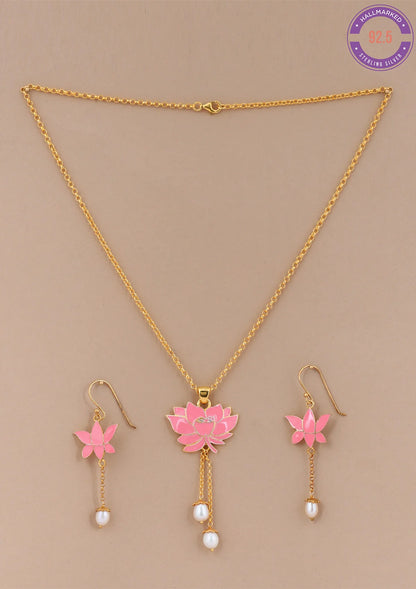 Gold Finish Silver Lotus Pendant Necklace with Earrings